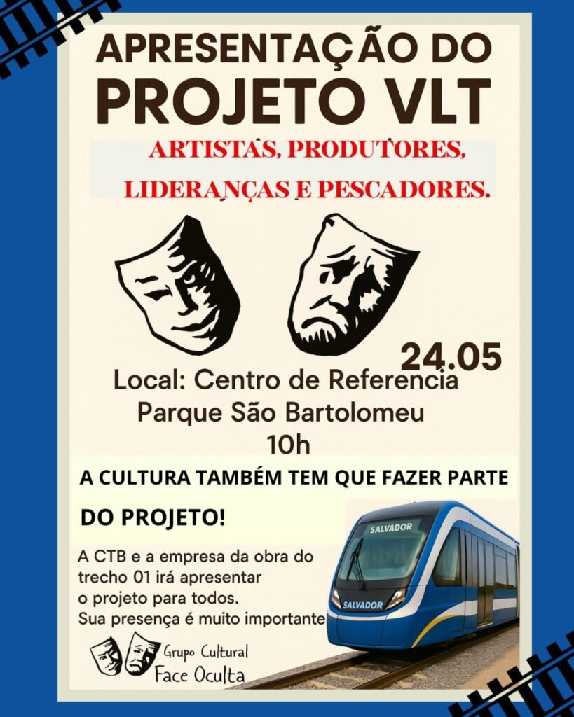 O Grupo Cultural Face Oculta convida todos os artistas, produtores culturais, pescadores e lideranças locais para participarem da Apresentação do Projeto VLT – Trecho 01, que acontecerá no dia 24 de maio, às 10h, no Centro de Referência do Parque São Bartolomeu.