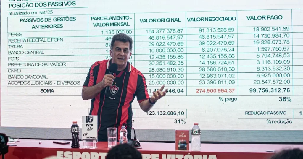 Mota também destacou as dívidas herdadas de gestões anteriores. Ao assumir o clube em 2022, o passivo era de R$ 361,4 milhões, reduzido após negociações para R$ 274,9 milhões, dos quais R$ 99,7 milhões já foram pagos. Ainda restam R$ 203,4 milhões, com pagamentos mensais de R$ 4,1 milhões, parcialmente cobertos pelo aporte da LFU e pela venda dos direitos de transmissão.