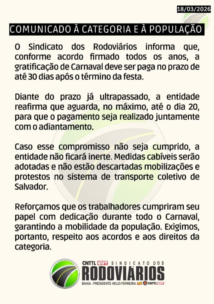 Esses dias nas redes sociais do SINDICATO DOS RODOVIÁRIOS DE SALVADOR declarou o cartaz abaixo