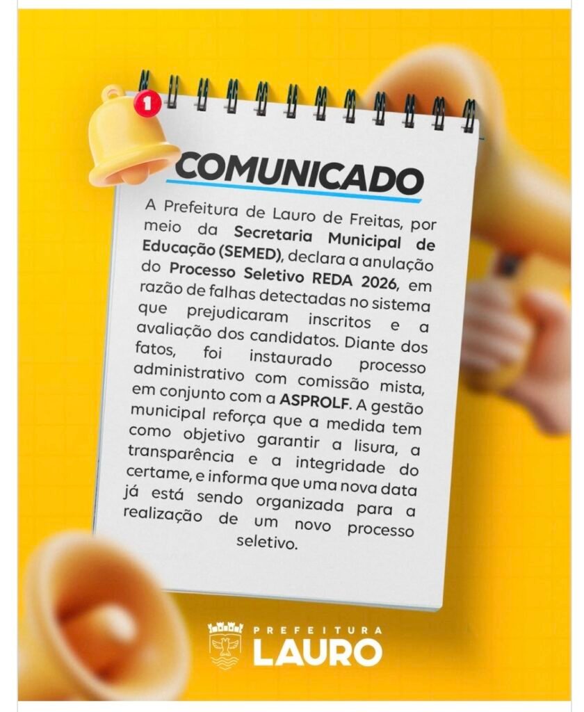 Veja comunicado da Prefeitura de Lauro de Freitas na íntegra: “A Prefeitura de Lauro de Freitas, por meio da Secretaria Municipal de Educação (SEMED), informa a anulação do Processo Seletivo REDA 2026, em razão de falhas identificadas no sistema que comprometeram a lisura das inscrições e da avaliação dos candidatos.Diante dos fatos, foi instaurado processo administrativo com comissão mista, em conjunto com a ASPROLF, para apuração e adoção das medidas cabíveis.