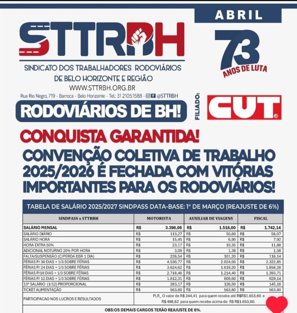 A Convenção Coletiva de Trabalho 2025/2026 dos rodoviários do setor intermunicipal, fretamento e turismo foi FECHADA com vitórias importantes para a categoria! Graças à união e mobilização dos trabalhadores, conseguimos assegurar: ✅ Reajuste salarial com ganho real de 1,23% ✅ Vale-alimentação com reajuste de 26,64% com um ganho real de 1,23% e um ajuste no ticket-alimentação de 26,64% o sindicato dos trabalhadores de transporte de Minas Gerais comemorou o fechamento do acordo da campanha salarial 2025/2026.