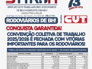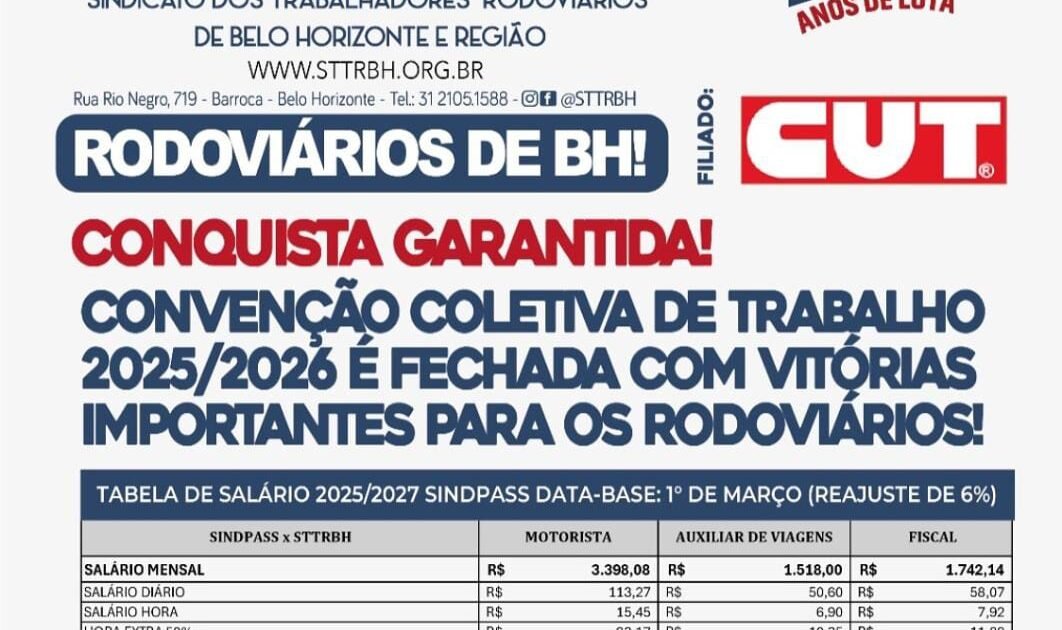A Convenção Coletiva de Trabalho 2025/2026 dos rodoviários do setor intermunicipal, fretamento e turismo foi FECHADA com vitórias importantes para a categoria! Graças à união e mobilização dos trabalhadores, conseguimos assegurar: ✅ Reajuste salarial com ganho real de 1,23% ✅ Vale-alimentação com reajuste de 26,64% com um ganho real de 1,23% e um ajuste no ticket-alimentação de 26,64% o sindicato dos trabalhadores de transporte de Minas Gerais comemorou o fechamento do acordo da campanha salarial 2025/2026.